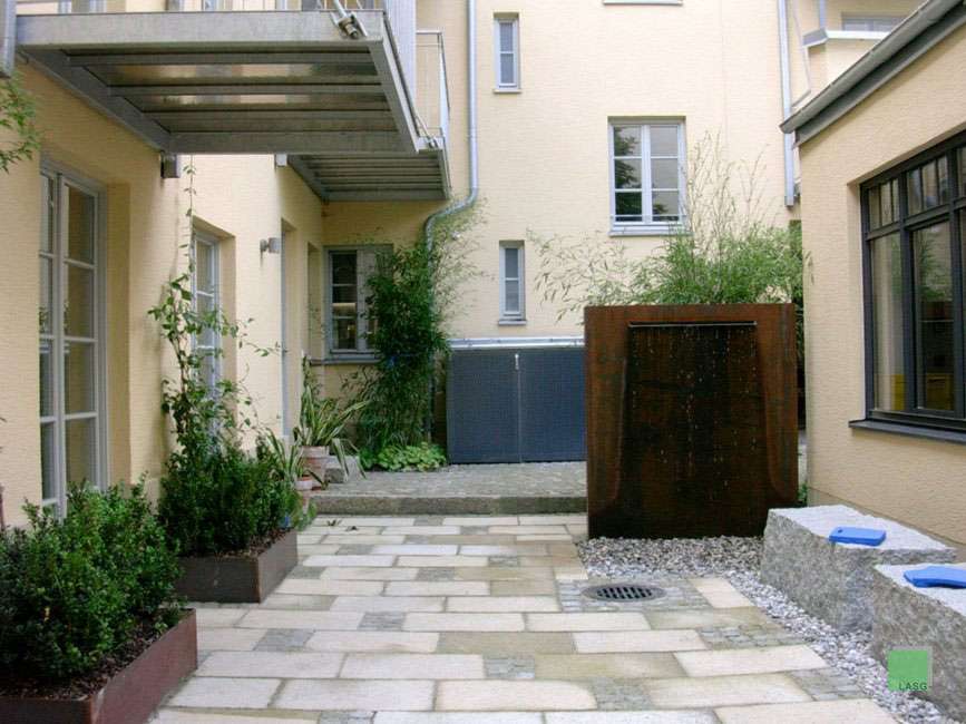 Hesseloherstr., München, Umgestaltung und Sanierung eines Wohn- und Geschäftshauses, Brunnen aus Stahl, Architekt: Harald Staub, Wolfratshausen