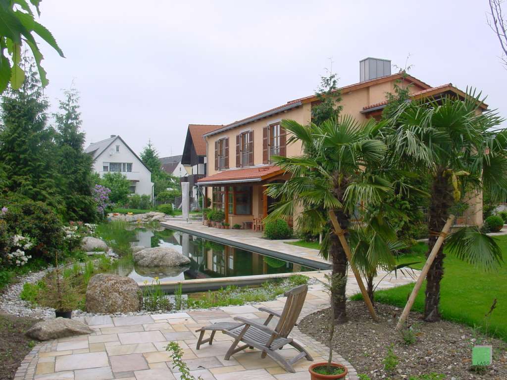 Kurpark Murnau, Ufergestaltung des neu angelegten Teiches mit Bachlauf und Springbrunnen
